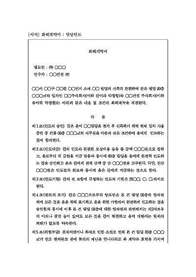 주요내용 : 인도합의, 인도대금 지급방법, 인도기한, 권리의 포기, 위험부담, 인수인의 의무 등 내용 기재 . 단 무단전재 방지목적으로 PDF 파일로 올리니, 구매하신 후 혹 원본 파일이 필요하신 분들은 톡이나 문자, 메일, 전화 등을 주시면 작성방법 등에 대한 간단한 무료상담과 함께 원본 파일을 보내드리도록 하겠습니다.