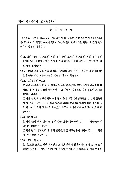 주요내용 : 경계확정, 초과부분 인도, 철거비용, 경계표의 시공, 화해절차 등 내용 기재. 단 무단전재 방지목적으로 PDF 파일로 올리니, 구매하신 후 혹 원본 파일이 필요하신 분들은 톡이나 문자, 메일, 전화 등을 주시면 작성방법 등에 대한 간단한 무료상담과 함께 원본 파일을 보내드리도록 하겠습니다.