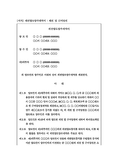 주요내용 : 양도양수계약, 하자담보책임, 제3채무자에 대한 통지 등 내용 기재. 단 무단전재 방지목적으로 PDF 파일로 올리니, 구매하신 후 혹 원본 파일이 필요하신 분들은 톡이나 문자, 메일, 전화 등을 주시면 작성방법 등에 대한 간단한 무료상담과 함께 원본 파일을 보내드리도록 하겠습니다.