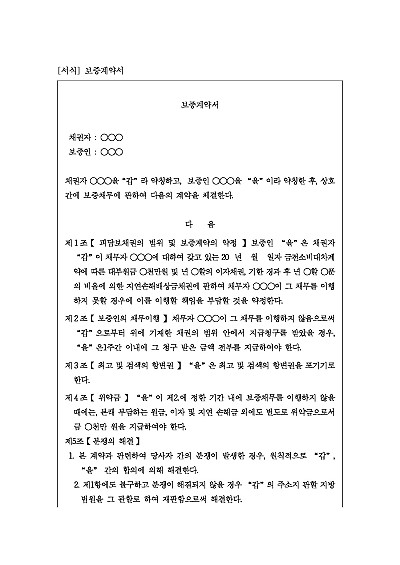주요내용 : 피담보채권의 범위 및 보증계약, 보증인의 채무이행, 최고 검색의 항변권 포기, 위약금 등 내용 기재. 단 무단전재 방지목적으로 PDF 파일로 올리니, 구매하신 후 혹 원본 파일이 필요하신 분들은 톡이나 문자, 메일, 전화 등을 주시면 작성방법 등에 대한 간단한 무료상담과 함께 원본 파일을 보내드리도록 하겠습니다.