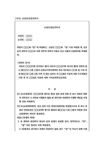 주요내용 : 채권의 표시, 보증계약, 기존 보증인 보증계약 해지 등 내용 기재. 단 무단전재 방지목적으로 PDF 파일로 올리니, 구매하신 후 혹 원본 파일이 필요하신 분들은 톡이나 문자, 메일, 전화 등을 주시면 작성방법 등에 대한 간단한 무료상담과 함께 원본 파일을 보내드리도록 하겠습니다.