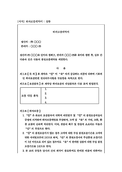 주요내용 : 보증품목, 하자보증, 손해배상, 계약 유효기간, 계약해지 등 내용 기재. 단 무단전재 방지목적으로 PDF 파일로 올리니, 구매하신 후 혹 원본 파일이 필요하신 분들은 톡이나 문자, 메일, 전화 등을 주시면 작성방법 등에 대한 간단한 무료상담과 함께 원본 파일을 보내드리도록 하겠습니다.