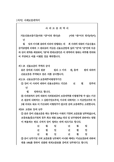 주요내용 : 보증료, 사채의 발행조건, 기재사항, 주채무자이행의무와 통지의무, 사전구상, 채권보전조치, 담보 및 보험, 사환범위, 연대보증인의 책임, 변제 충당순서,위험부담 및 면책조항 등 내용 기재 . 단 무단전재 방지목적으로 PDF 파일로 올리니, 구매하신 후 혹 원본 파일이 필요하신 분들은 톡이나 문자, 메일, 전화 등을 주시면 작성방법 등에 대한 간단한 무료상담과 함께 원본 파일을 보내드리도록 하겠습니다.