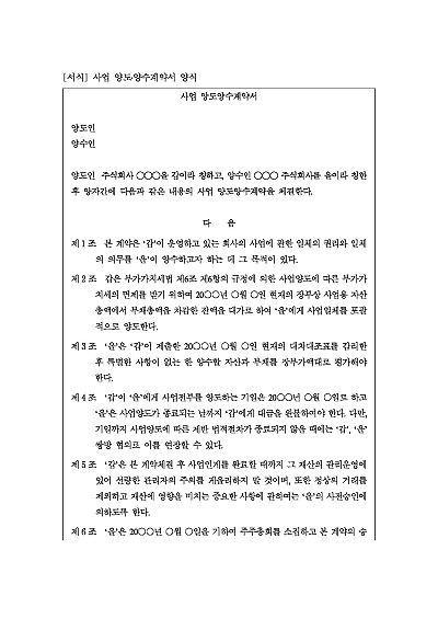 주요내용 : 대상 사업특정, 자산평가, 양도전 회사운영, 주주총회, 직원승계 등 내용 기재. 단 무단전재 방지목적으로 PDF 파일로 올리니, 구매하신 후 혹 원본 파일이 필요하신 분들은 톡이나 문자, 메일, 전화 등을 주시면 작성방법 등에 대한 간단한 무료상담과 함께 원본 파일을 보내드리도록 하겠습니다.