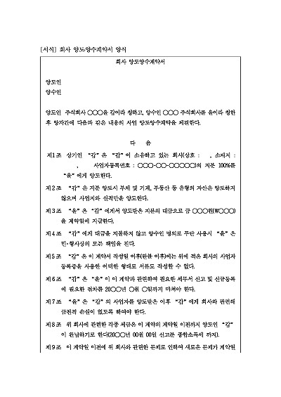 주요내용 : 회사특정, 양도대상, 양도대금지급방법, 계약서 작성일이후 권리의무, 세금완납 등 내용 기재. 단 무단전재 방지목적으로 PDF 파일로 올리니, 구매하신 후 혹 원본 파일이 필요하신 분들은 톡이나 문자, 메일, 전화 등을 주시면 작성방법 등에 대한 간단한 무료상담과 함께 원본 파일을 보내드리도록 하겠습니다.