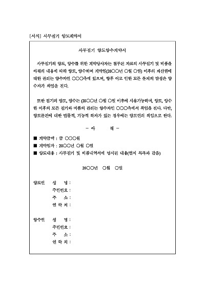 주요내용 : 양도물품 목록, 양도양수에 따른 책임부담 등 내용 기재. 단 무단전재 방지목적으로 PDF 파일로 올리니, 구매하신 후 혹 원본 파일이 필요하신 분들은 톡이나 문자, 메일, 전화 등을 주시면 작성방법 등에 대한 간단한 무료상담과 함께 원본 파일을 보내드리도록 하겠습니다.
