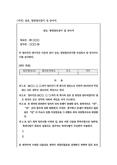 주요내용 : 영업상 채무의 부담 등 상호 및 영업양도증서 교부관련 서식임. 단 무단전재 방지목적으로 PDF 파일로 올리니, 구매하신 후 혹 원본 파일이 필요하신 분들은 톡이나 문자, 메일, 전화 등을 주시면 작성방법 등에 대한 간단한 무료상담과 함께 원본 파일을 보내드리도록 하겠습니다.
