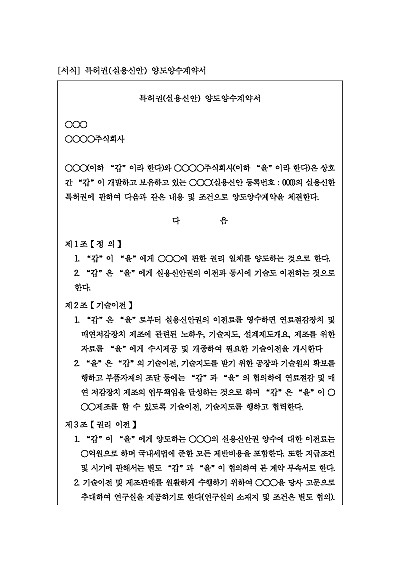 주요내용 : 기술이전, 상표, 시장질서 유지, 비밀준수 의무, 발명, 의장, 불가항력, 유효기간 등 내용 기재. 단 무단전재 방지목적으로 PDF 파일로 올리니, 구매하신 후 혹 원본 파일이 필요하신 분들은 톡이나 문자, 메일, 전화 등을 주시면 작성방법 등에 대한 간단한 무료상담과 함께 원본 파일을 보내드리도록 하겠습니다.