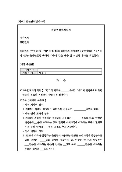 주요내용 : 독점 출판권 설정, 저작권 사용료, 계약 존속기간 및 범위, 저작권 보증 및 침해책임, 저작권 표시, 저작물의 사용과 2차적 저작물, 계약해지 사유 등 내용 기재. 단 무단전재 방지목적으로 PDF 파일로 올리니, 구매하신 후 혹 원본 파일이 필요하신 분들은 톡이나 문자, 메일, 전화 등을 주시면 작성방법 등에 대한 간단한 무료상담과 함께 원본 파일을 보내드리도록 하겠습니다.