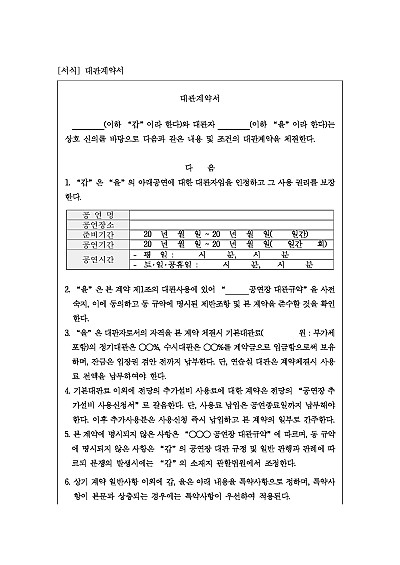 주요내용 : 대관공연 특정, 제반규약 준수, 대관료 및 지급방법 등 내용 기재. 단 무단전재 방지목적으로 PDF 파일로 올리니, 구매하신 후 혹 원본 파일이 필요하신 분들은 톡이나 문자, 메일, 전화 등을 주시면 작성방법 등에 대한 간단한 무료상담과 함께 원본 파일을 보내드리도록 하겠습니다.