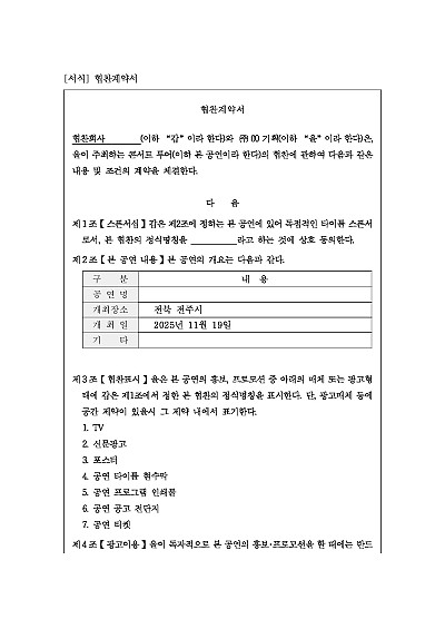 주요내용 : 스폰서십, 공연내용, 협찬표시, 광고이용, 을의 의무 부가서비스, 대가, 권리양도금지, 계약위반 효과 등 내용 기재. 단 무단전재 방지목적으로 PDF 파일로 올리니구매하신 후 혹 원본 파일이 필요하신 분들은 톡이나 문자메일전화 등을 주시면 작성방법 등에 대한 간단한 무료상담과 함께 원본 파일을 보내드리도록 하겠습니다.