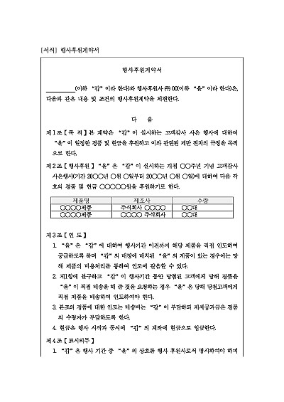 주요내용 : 행사후원 품목, 인도, 표시의무, 경품하자 책임, 배송일자, 이익부여 등 내용 기재. 단 무단전재 방지목적으로 PDF 파일로 올리니구매하신 후 혹 원본 파일이 필요하신 분들은 톡이나 문자메일전화 등을 주시면 작성방법 등에 대한 간단한 무료상담과 함께 원본 파일을 보내드리도록 하겠습니다.