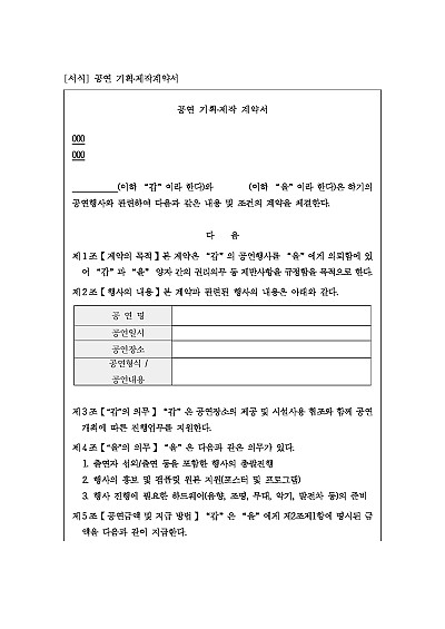주요내용 : 행사의 내용, 갑을의 의무, 공연금액 및 지급방법, 계약해지 사유, 위약금, 손해배상 등 내용 기재. 단 무단전재 방지목적으로 PDF 파일로 올리니, 구매하신 후 혹 원본 파일이 필요하신 분들은 톡이나 문자, 메일, 전화 등을 주시면 작성방법 등에 대한 간단한 무료상담과 함께 원본 파일을 보내드리도록 하겠습니다.