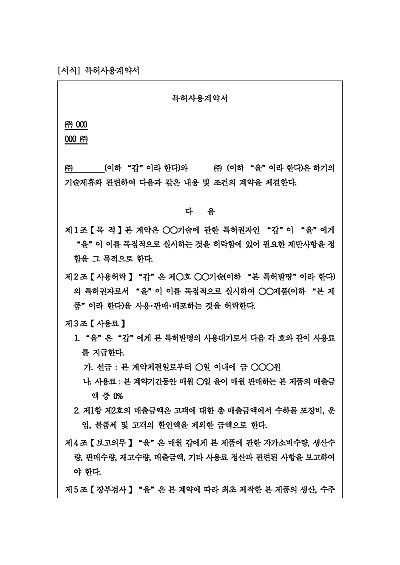 주요내용 : 사용허락 및 사용료, 보고의무, 장부검사, 통지의무, 신규발명, 비밀준수의무, 계약기간 및 변경, 권리의무 승계, 양도금지, 계약해지 및 해제 등 내용 기재. 단 무단전재 방지목적으로 PDF 파일로 올리니, 구매하신 후 혹 원본 파일이 필요하신 분들은 톡이나 문자, 메일, 전화 등을 주시면 작성방법 등에 대한 간단한 무료상담과 함께 원본 파일을 보내드리도록 하겠습니다.
