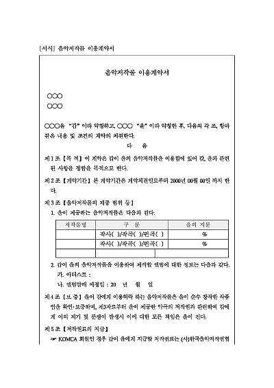주요내용 : 계약기간, 저작물 제공범위, 보증, 저작권료 지급 등에 관한 내용 기재. 단 무단전재 방지목적으로 PDF 파일로 올리니, 구매하신 후 혹 원본 파일이 필요하신 분들은 톡이나 문자, 메일, 전화 등을 주시면 작성방법 등에 대한 간단한 무료상담과 함께 원본 파일을 보내드리도록 하겠습니다.