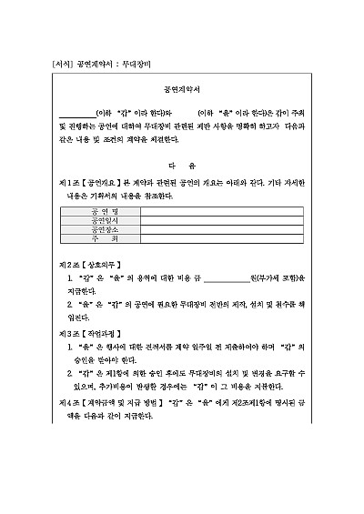 주요내용 : 대상공연, 상호의무, 작업과정, 계약금 및 지급방법, 계약해지 사유, 안전관리 책임 등 내용 기재. 단 무단전재 방지목적으로 PDF 파일로 올리니, 구매하신 후 혹 원본 파일이 필요하신 분들은 톡이나 문자, 메일, 전화 등을 주시면 작성방법 등에 대한 간단한 무료상담과 함께 원본 파일을 보내드리도록 하겠습니다.