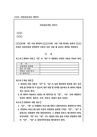 주요내용 : 계약내용, 개발물에 대한 권리, 공동저작자로서의 지위, 자료제공 및 협조, 개발자금, 비밀유지, 수익배분, 계약의 해지 등 내용 기재. 단 무단전재 방지목적으로 PDF 파일로 올리니구매하신 후 혹 원본 파일이 필요하신 분들은 톡이나 문자메일전화 등을 주시면 작성방법 등에 대한 간단한 무료상담과 함께 원본 파일을 보내드리도록 하겠습니다.