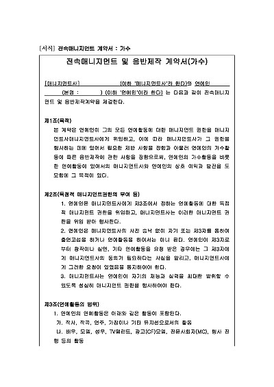 주요내용 : 독점적 매니저먼트권한 부여, 연예활동 범위, 매니지먼트권한의 범위, 음반의 제작, 인세의 배분, 연예활동의 수익금 분배, 저작권, 상표권 초상권 등, 권리침해에 대한 대응, 계약기간 등 내용 기재. 단 무단전재 방지목적으로 PDF 파일로 올리니, 구매하신 후 혹 원본 파일이 필요하신 분들은 톡이나 문자, 메일, 전화 등을 주시면 작성방법 등에 대한 간단한 무료상담과 함께 원본 파일을 보내드리도록 하겠습니다.