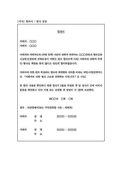 주요내용 : 합의사건 표시, 합의금, 부제소 합의, 선처 및 고소취하 등 내용 기재. 단 무단전재 방지목적으로 PDF 파일로 올리니, 구매하신 후 혹 원본 파일이 필요하신 분들은 톡이나 문자, 메일, 전화 등을 주시면 작성방법 등에 대한 간단한 무료상담과 함께 원본 파일을 보내드리도록 하겠습니다.