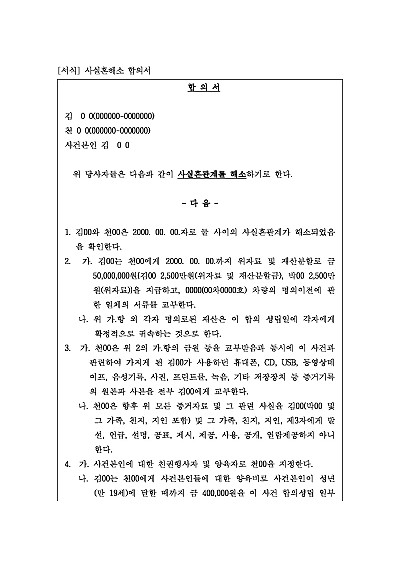 주요내용 : 사실혼관계 유지 중 상호 합의하에 사실혼을 해소하기로 하고, 그에 따라 위자료 재산분할, 친권 양육권, 양육비 등을 정할 때 사용되는 양식임, 단 무단전재 방지목적으로 PDF 파일로 올리니, 구매하신 후 혹 원본 파일이 필요하신 분들은 톡이나 문자, 메일, 전화 등을 주시면 작성방법 등에 대한 간단한 무료상담과 함께 원본 파일을 보내드리도록 하겠습니다.