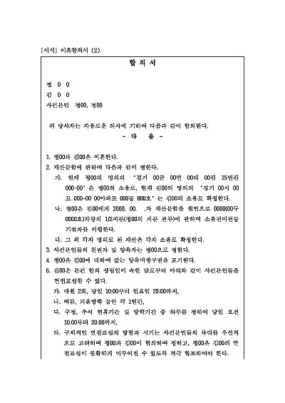 주요내용 : 이혼 소송 중 이혼 및 위자료, 재산분할, 친권 및 양육권 등에 관한 합의를 도출하여 소송을 조기에 종결할 목적으로 사용되는 양식임. 단 무단전재 방지목적으로 PDF 파일로 올리니, 구매하신 후 혹 원본 파일이 필요하신 분들은 톡이나 문자, 메일, 전화 등을 주시면 작성방법 등에 대한 간단한 무료상담과 함께 원본 파일을 보내드리도록 하겠습니다.