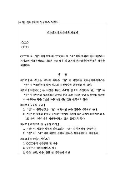 주요내용 : 목적 및 약정기간, 상품의 공급, 제공되는 서비스, 비용, 상품의 교환 등, 손해배상, 약정해지, 권리 양도금지, 결제조건 등 내용 기재. 단 무단전재 방지목적으로 PDF 파일로 올리니, 구매하신 후 혹 원본 파일이 필요하신 분들은 톡이나 문자, 메일, 전화 등을 주시면 작성방법 등에 대한 간단한 무료상담과 함께 원본 파일을 보내드리도록 하겠습니다.