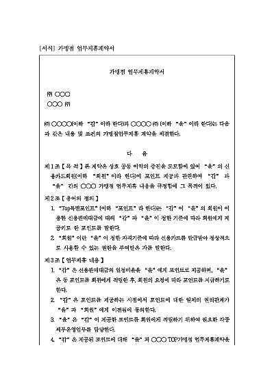 주요내용 : 업무제휴 내용, 대상회원, 포인트 제공율 및 정산방식, 호보, 기밀유지, 계약의 유효기간, 계약의 해지 등 내용 기재. 단 무단전재 방지목적으로 PDF 파일로 올리니, 구매하신 후 혹 원본 파일이 필요하신 분들은 톡이나 문자, 메일, 전화 등을 주시면 작성방법 등에 대한 간단한 무료상담과 함께 원본 파일을 보내드리도록 하겠습니다.
