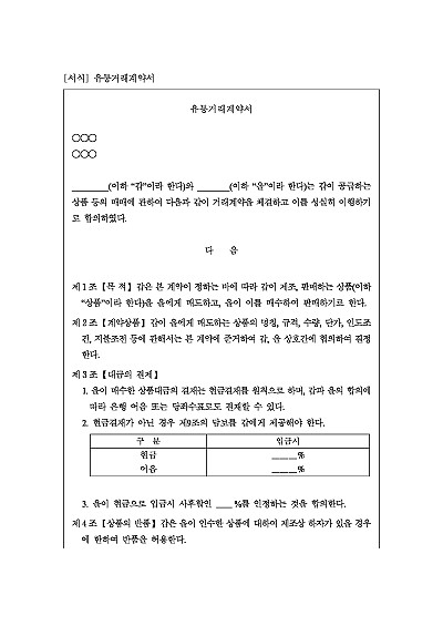 주요내용 : 목적 및 계약상품, 대금의 결제, 상품의 반품, 상품 소유권 이전, 사용인감의 신고, 자료열람, 을의 협조사안, 담보의 제공, 계약의 해지, 상품의 회수, 기한의 이익, 지연손해금, 담보권실행, 연대보증인 책임, 권리양도 금지 등 내용 기재. 단 무단전재 방지목적으로 PDF 파일로 올리니, 구매하신 후 혹 원본 파일이 필요하신 분들은 톡이나 문자, 메일, 전화 등을 주시면 작성방법 등에 대한 간단한 무료상담과 함께 원본 파일을 보내드리도록 하겠습니다.