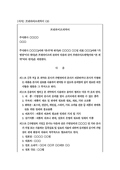 주요내용 : 가맹점 가입, 가맹금, 로열티 및 보증금, 초기시설투자비, 점포시설, 부자재 및 제품의 공급, 영업의 승계, 보험가입, 경영지도, 영업보고, 영업시간, 복장, 광고, 판촉물, 운영규칙, 비밀준수의무, 통지의무, 계약기간, 계약의 변경, 권리의무의 승계, 권리 등의 양도금지, 계약해지, 영업종료 후의 처리 등 내용 기재. 단 무단전재 방지목적으로 PDF 파일로 올리니, 구매하신 후 혹 원본 파일이 필요하신 분들은 톡이나 문자, 메일, 전화 등을 주시면 작성방법 등에 대한 간단한 무료상담과 함께 원본 파일을 보내드리도록 하겠습니다.