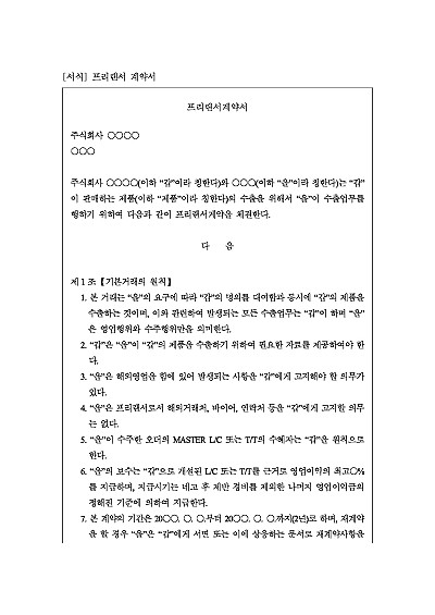 주요내용 : 기본거래의 원칙, 거래방법, 성과급 지급, 경비부담, 품질검사 및 품질불량, 통지의무, 계약해지, 유효기간, 내용변경, 양도금지 등 내용 기재. 단 무단전재 방지목적으로 PDF 파일로 올리니, 구매하신 후 혹 원본 파일이 필요하신 분들은 톡이나 문자, 메일, 전화 등을 주시면 작성방법 등에 대한 간단한 무료상담과 함께 원본 파일을 보내드리도록 하겠습니다.