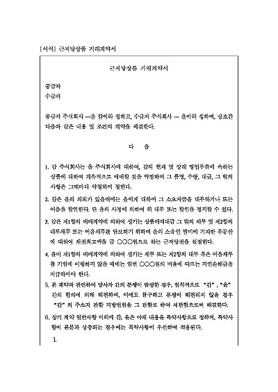 주요내용 : 계속적 상품 매매 약정, 매매대금 담보목적 근정당권설정, 지연손해금 지급 등 내용 기재. 단 무단전재 방지목적으로 PDF 파일로 올리니, 구매하신 후 혹 원본 파일이 필요하신 분들은 톡이나 문자, 메일, 전화 등을 주시면 작성방법 등에 대한 간단한 무료상담과 함께 원본 파일을 보내드리도록 하겠습니다.