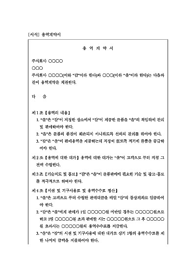 주요내용 : 용역 내용, 용역에 대한 대가, 기술지도 및 홍보, 시설 및 기구사용료, 용역수수료 정산, 재고관리, 비밀유지, 계약해지 및 손배, 용역계약 기간 등 내용 기재. 단 무단전재 방지목적으로 PDF 파일로 올리니, 구매하신 후 혹 원본 파일이 필요하신 분들은 톡이나 문자, 메일, 전화 등을 주시면 작성방법 등에 대한 간단한 무료상담과 함께 원본 파일을 보내드리도록 하겠습니다.