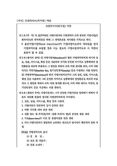 주요내용 : 권리의 부여, 영업지역, 계약기간, 계약의 해지, 계약의 종료와 조치, 가입비, 정기납입경비, 계약이행보증금, 교육 및 훈련, 경영지도, 감독 시정권, 점포의 설치장소의 선정, 점포의 설비, 주방기기의 설치 유지, 설비 및 기기의 대여, 광고, 영업양도 및 담보제공, 영업의 상속, 상품의 조달 및 관리, 상품의 하자와 검사, 상품공급의 중단, 영업 및 복장, 보고의무, 보험, 가맹계약자 및 사업자의 의무, 지연이자 등 내용 기재. 단 무단전재 방지목적으로 PDF 파일로 올리니, 구매하신 후 혹 원본 파일이 필요하신 분들은 톡이나 문자, 메일, 전화 등을 주시면 작성방법 등에 대한 간단한 무료상담과 함께 원본 파일을 보내드리도록 하겠습니다.