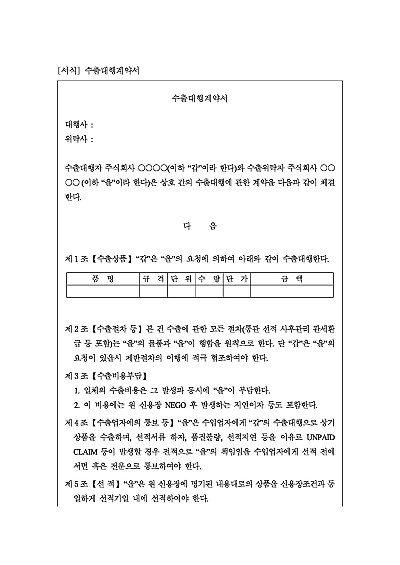 주요내용 : 수츨상품, 수출절차, 수출비용부담, 수출업자에의 통보, 대금결제 등, 손해배상, 담보, 우선적 효력 등 내용 기재. 단 무단전재 방지목적으로 PDF 파일로 올리니, 구매하신 후 혹 원본 파일이 필요하신 분들은 톡이나 문자, 메일, 전화 등을 주시면 작성방법 등에 대한 간단한 무료상담과 함께 원본 파일을 보내드리도록 하겠습니다.