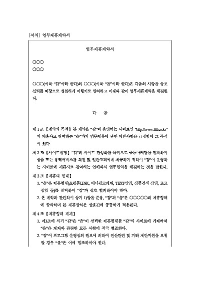 주요내용 : 제휴형태, 제휴형태 게재, 서비스절차, 마케팅수수료, 계약기간 및 연장, 상표사용, 공동마케팅, 권리의무의 양도금지, 비밀준수 및 지식재산권 분쟁, 계약의 해지, 손해배상 등 내용 기재, 단 무단전재 방지목적으로 PDF 파일로 올리니, 구매하신 후 혹 원본 파일이 필요하신 분들은 톡이나 문자, 메일, 전화 등을 주시면 작성방법 등에 대한 간단한 무료상담과 함께 원본 파일을 보내드리도록 하겠습니다.