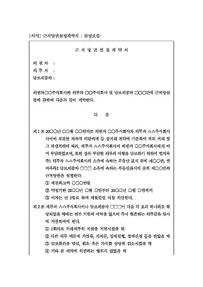 주요내용 : 계속적 거래관계, 채무이행 담보목적 담보제공, 기한의 이익상실, 담보물 형상변경 등 동의, 채무불이행시 대물변제 방법 등 내용 기재. 단 무단전재 방지목적으로 PDF 파일로 올리니, 구매하신 후 혹 원본 파일이 필요하신 분들은 톡이나 문자, 메일, 전화 등을 주시면 작성방법 등에 대한 간단한 무료상담과 함께 원본 파일을 보내드리도록 하겠습니다.