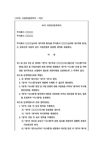 주요내용 : 계약목적, 계약당사자 역할, 업무분담, 업무내용, 영업범위 및 권한, 계약내용, 정산방법, 계약기간, 사용의 제약, 계약해지, 손해배상, 비밀보장 등 내용 기재. 단 무단전재 방지목적으로 PDF 파일로 올리니, 구매하신 후 혹 원본 파일이 필요하신 분들은 톡이나 문자, 메일, 전화 등을 주시면 작성방법 등에 대한 간단한 무료상담과 함께 원본 파일을 보내드리도록 하겠습니다.