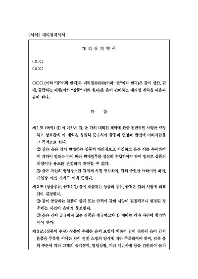 주요내용 : 계약목적, 상품종류 및 규격, 상품의 수량, 상품의 운송 등, 판매가격, 대금결제, 권리의무 양도금지, 담보제공 및 재정보증, 지도육성 및 자료제공, AS, 공고 및 전시, 계약해지, 손해배상, 계약기간 등 내용 기재. 단 무단전재 방지목적으로 PDF 파일로 올리니, 구매하신 후 혹 원본 파일이 필요하신 분들은 톡이나 문자, 메일, 전화 등을 주시면 작성방법 등에 대한 간단한 무료상담과 함께 원본 파일을 보내드리도록 하겠습니다.