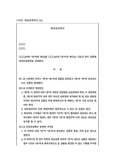 주요내용 : 계약 목적, 대리점 영업권, 취급상품의 범위 및 가격, 할인판매금지, 상품의 인도 및 반품, 대금지급, 계약위반시 조치, 유효기간 등 내용 기재. 단 무단전재 방지목적으로 PDF 파일로 올리니구매하신 후 혹 원본 파일이 필요하신 분들은 톡이나 문자메일전화 등을 주시면 작성방법 등에 대한 간단한 무료상담과 함께 원본 파일을 보내드리도록 하겠습니다.