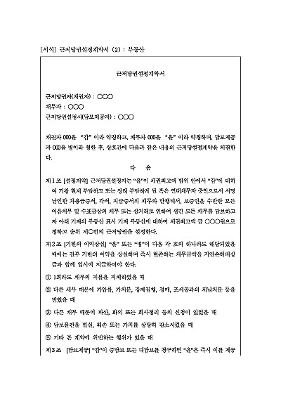 주요내용 : 설정계약 및 범위, 기한의 이익상실, 담보제공, 담보물처분 동의, 담보물조사, 등기비용 부담 등 내용 기재. 단 무단전재 방지목적으로 PDF 파일로 올리니, 구매하신 후 혹 원본 파일이 필요하신 분들은 톡이나 문자, 메일, 전화 등을 주시면 작성방법 등에 대한 간단한 무료상담과 함께 원본 파일을 보내드리도록 하겠습니다.