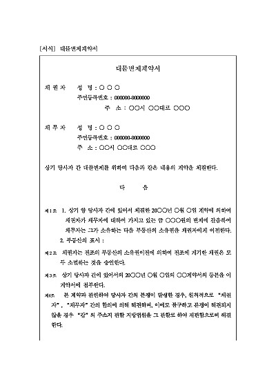 주요내용 : 대물변제 대상 부동산기재, 채권소멸 승인, 분쟁해결방법 등 내용 기재. 단 무단전재 방지목적으로 PDF 파일로 올리니, 구매하신 후 혹 원본 파일이 필요하신 분들은 톡이나 문자, 메일, 전화 등을 주시면 작성방법 등에 대한 간단한 무료상담과 함께 원본 파일을 보내드리도록 하겠습니다.