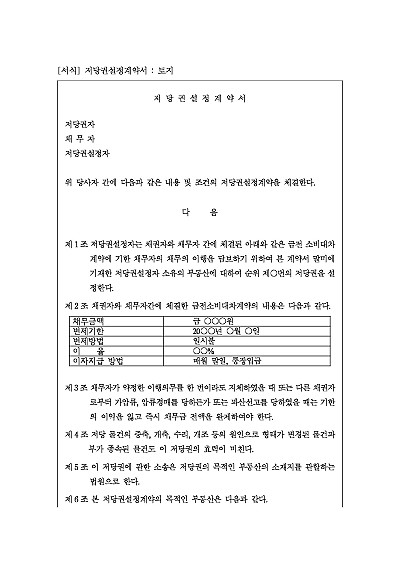 주요내용 : 저당권설정 및 금전소비대차계약, 기한의 이익상실 등, 저당권의 효력범위 등 내용 기재. 단 무단전재 방지목적으로 PDF 파일로 올리니, 구매하신 후 혹 원본 파일이 필요하신 분들은 톡이나 문자, 메일, 전화 등을 주시면 작성방법 등에 대한 간단한 무료상담과 함께 원본 파일을 보내드리도록 하겠습니다.