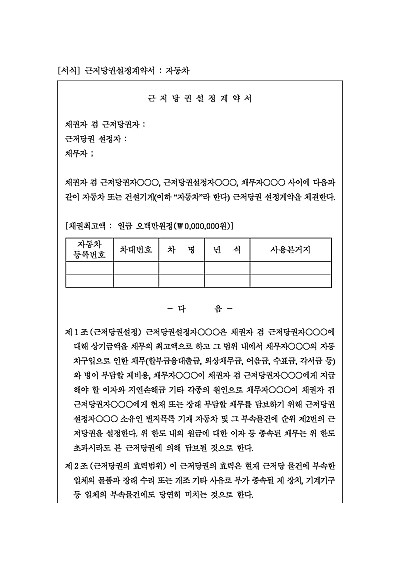 주요내용 : 대상자동차, 근저당설정, 효력범위, 변제방법 등, 보험계약, 저당물건의 경매 및 회수, 제 절차의 이행과 비용 등 내용 기재, . 단 무단전재 방지목적으로 PDF 파일로 올리니, 구매하신 후 혹 원본 파일이 필요하신 분들은 톡이나 문자, 메일, 전화 등을 주시면 작성방법 등에 대한 간단한 무료상담과 함께 원본 파일을 보내드리도록 하겠습니다.
