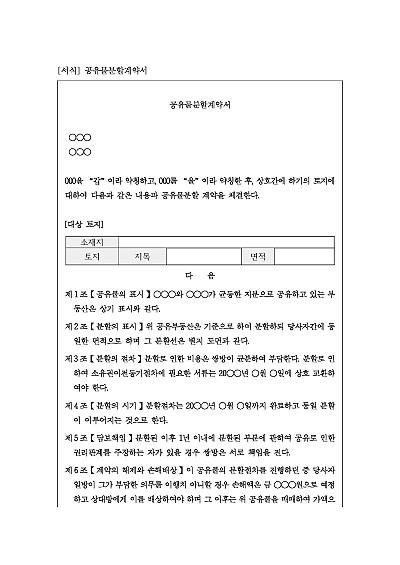 주요내용 : 공유물표시, 분할의 표시, 분할절차, 분할시기, 담보책임, 계약해지 및 손배 등 내용 기재. 단 무단전재 방지목적으로 PDF 파일로 올리니, 구매하신 후 혹 원본 파일이 필요하신 분들은 톡이나 문자, 메일, 전화 등을 주시면 작성방법 등에 대한 간단한 무료상담과 함께 원본 파일을 보내드리도록 하겠습니다.