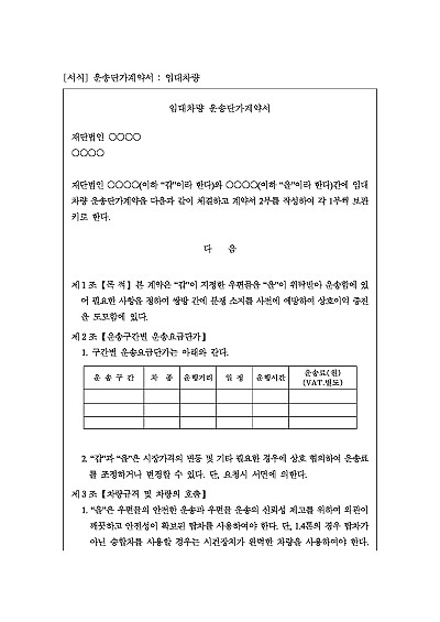 주요내용 : 운송구간별 운송요금단가, 차량규젹 및 차량의 호출, 계약기간 및 연장, 윤송료 지급 등, 운송확인자 지정, 운송시 유의사항, 근무규정 및 차량 지정, 사고책임 등, 계약이행보증금 제출, 계약해지 및 변경, 차량대체 요구, 권리양도 등 금지, 지체변상금 등 내용 기재. 단 무단전재 방지목적으로 PDF 파일로 올리니, 구매하신 후 혹 원본 파일이 필요하신 분들은 톡이나 문자, 메일, 전화 등을 주시면 작성방법 등에 대한 간단한 무료상담과 함께 원본 파일을 보내드리도록 하겠습니다.