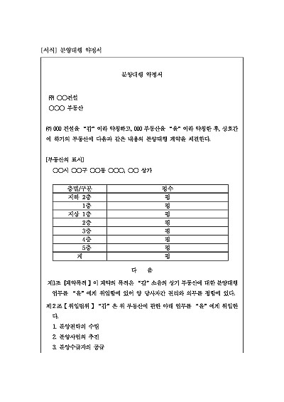 주요내용 : 위임범위, 분양계약체결 및 자금관리, 분양금액, 분양방법 및 기간, 홍보비용, 하자담보책임, 계약해지 등 내용 기재. 단 무단전재 방지목적으로 PDF 파일로 올리니구매하신 후 혹 원본 파일이 필요하신 분들은 톡이나 문자메일전화 등을 주시면 작성방법 등에 대한 간단한 무료상담과 함께 원본 파일을 보내드리도록 하겠습니다.