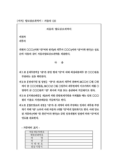 주요내용 : 채무금액, 변제기일 및 방법, 지연손해금, 양도담보 설정, 담보물건의 사용, 비용부담, 양도 등 금지, 기한의 이익상실, 연대보증인 등 내용 기재. 단 무단전재 방지목적으로 PDF 파일로 올리니, 구매하신 후 혹 원본 파일이 필요하신 분들은 톡이나 문자, 메일, 전화 등을 주시면 작성방법 등에 대한 간단한 무료상담과 함께 원본 파일을 보내드리도록 하겠습니다.