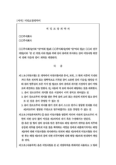 주요내용 : 비밀사항, 비밀유지의무, 사용목적, 개시범위, 복사, 조사권, 손해배상, 유효기간 등 내용 기재. 단 무단전재 방지목적으로 PDF 파일로 올리니, 구매하신 후 혹 원본 파일이 필요하신 분들은 톡이나 문자, 메일, 전화 등을 주시면 작성방법 등에 대한 간단한 무료상담과 함께 원본 파일을 보내드리도록 하겠습니다.