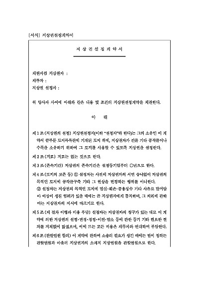 주요내용 : 지상권설정, 지료, 존속기간, 토지의 보존, 제 절차 이행과 비용 부담 등 내용 기재. 단 무단전재 방지목적으로 PDF 파일로 올리니, 구매하신 후 혹 원본 파일이 필요하신 분들은 톡이나 문자, 메일, 전화 등을 주시면 작성방법 등에 대한 간단한 무료상담과 함께 원본 파일을 보내드리도록 하겠습니다.
