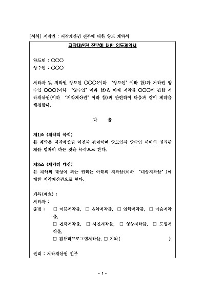 주요내용 : 계약의 목적 및 대상, 저작재산권 양도범위, 양도기간, 양도인의 의무, 양수인의 의무, 확인 및 보증, 계약내용의 변경, 계약의 해제, 비용부담, 손해배상 등 내용 기재. 단 무단전재 방지목적으로 PDF 파일로 올리니, 구매하신 후 혹 원본 파일이 필요하신 분들은 톡이나 문자, 메일, 전화 등을 주시면 작성방법 등에 대한 간단한 무료상담과 함께 원본 파일을 보내드리도록 하겠습니다.